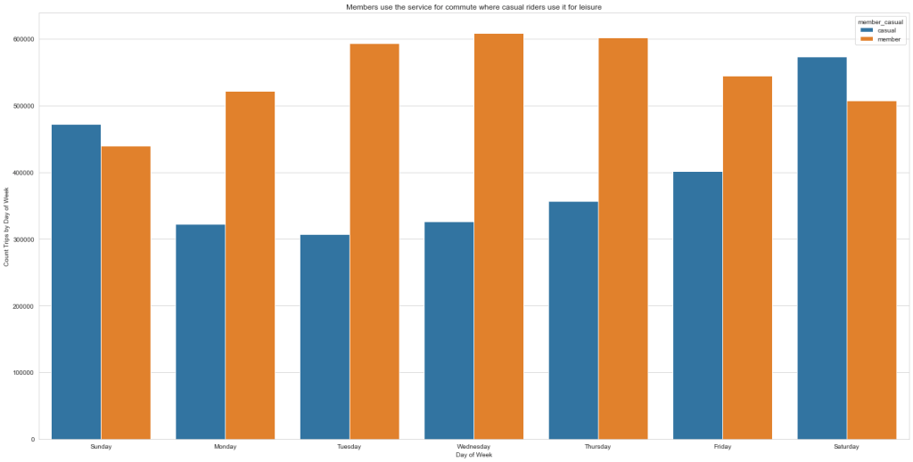 Another very interesting visual was created demonstrating the relationship between trips done and day of the week by members and casual riders, as seen below.