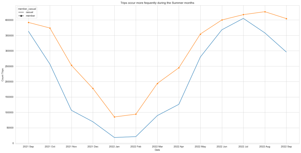 Another step, was to create visualization to better understand and see the patterns of differences between the users in this manner. It is a critical step, once if the right information is inputted, we can see more clearly the relationships. Once the months and count trips were inputted we could clearly see a pattern emerging.