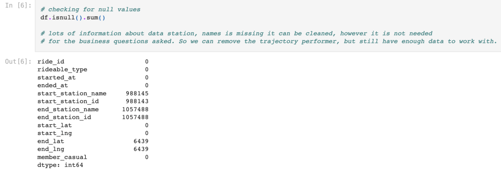 Besides that, I ran the code below to check for null values of the full dataframe. It was noted that the name of the stations, and Ids, of both starting and end station were missing in a significant manner ( 15% missing values (988,145 missing data points out of 6,584,382 total).